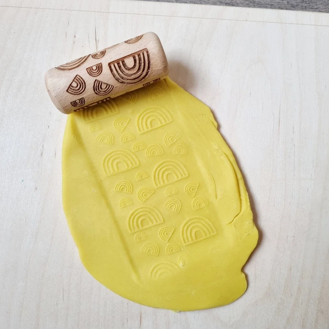 Wat is er nu leuker om klei te rollen met een roller die reliëf heeft! Met deze houten roller kun je je eigen regenboogjes rollen.